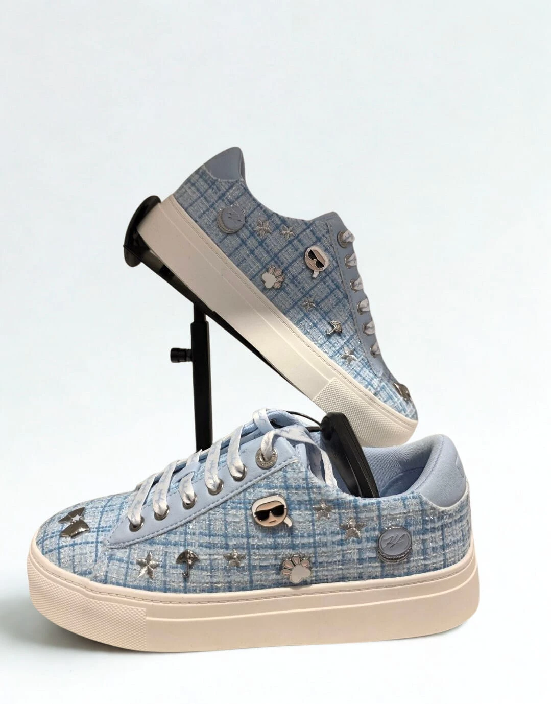 Stylowe sneakersy Karl Lagerfeld Paris Ikon Boucle w modnym pastelowym błękicie. Model wykonany z charakterystycznej tkaniny boucle, ozdobiony ikoną Karla Lagerfelda. Lekkie, wygodne i idealne do codziennych stylizacji w sezonie wiosna / lato. Oryginalny produkt marki Karl Lagerfeld – w pudełku.