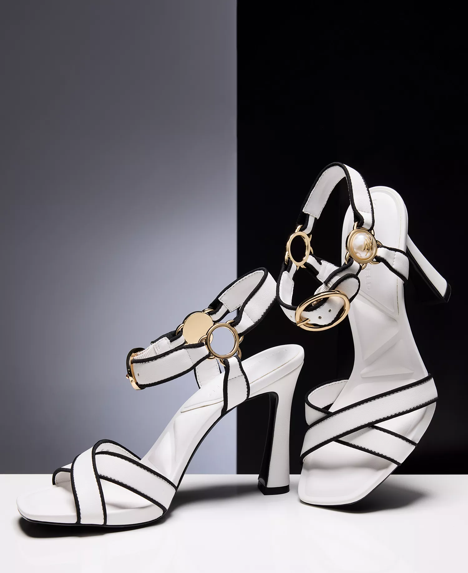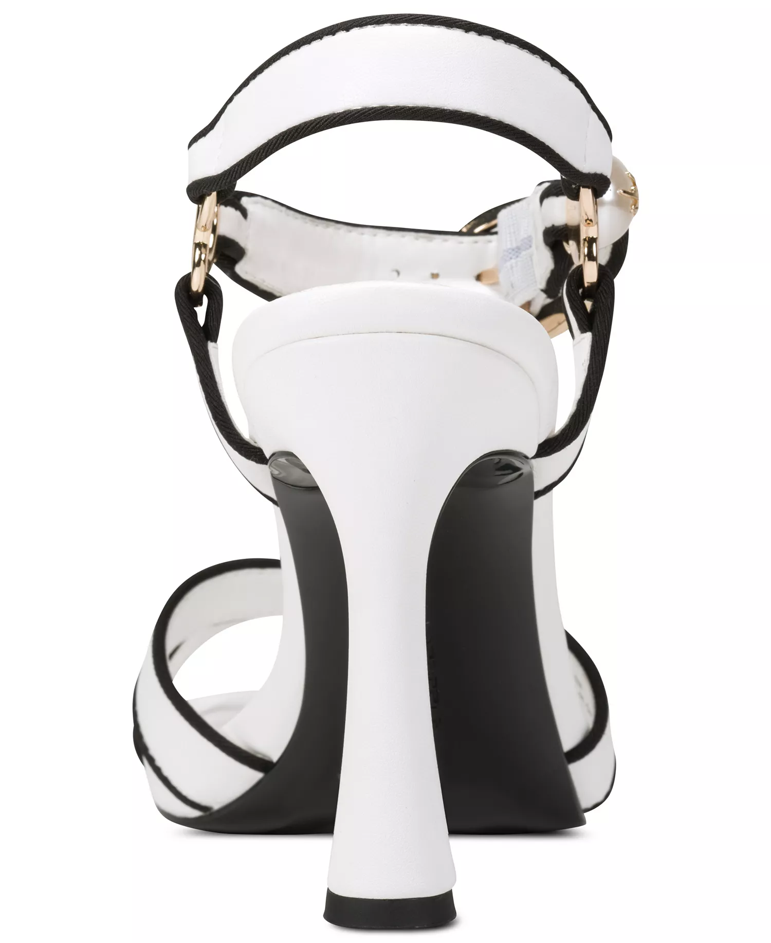 Eleganckie sandały KARL LAGERFELD PARIS na szpilce z paskiem wokół kostki, kwadratowym noskiem i ozdobnym perłowym detalem przy zapięciu.