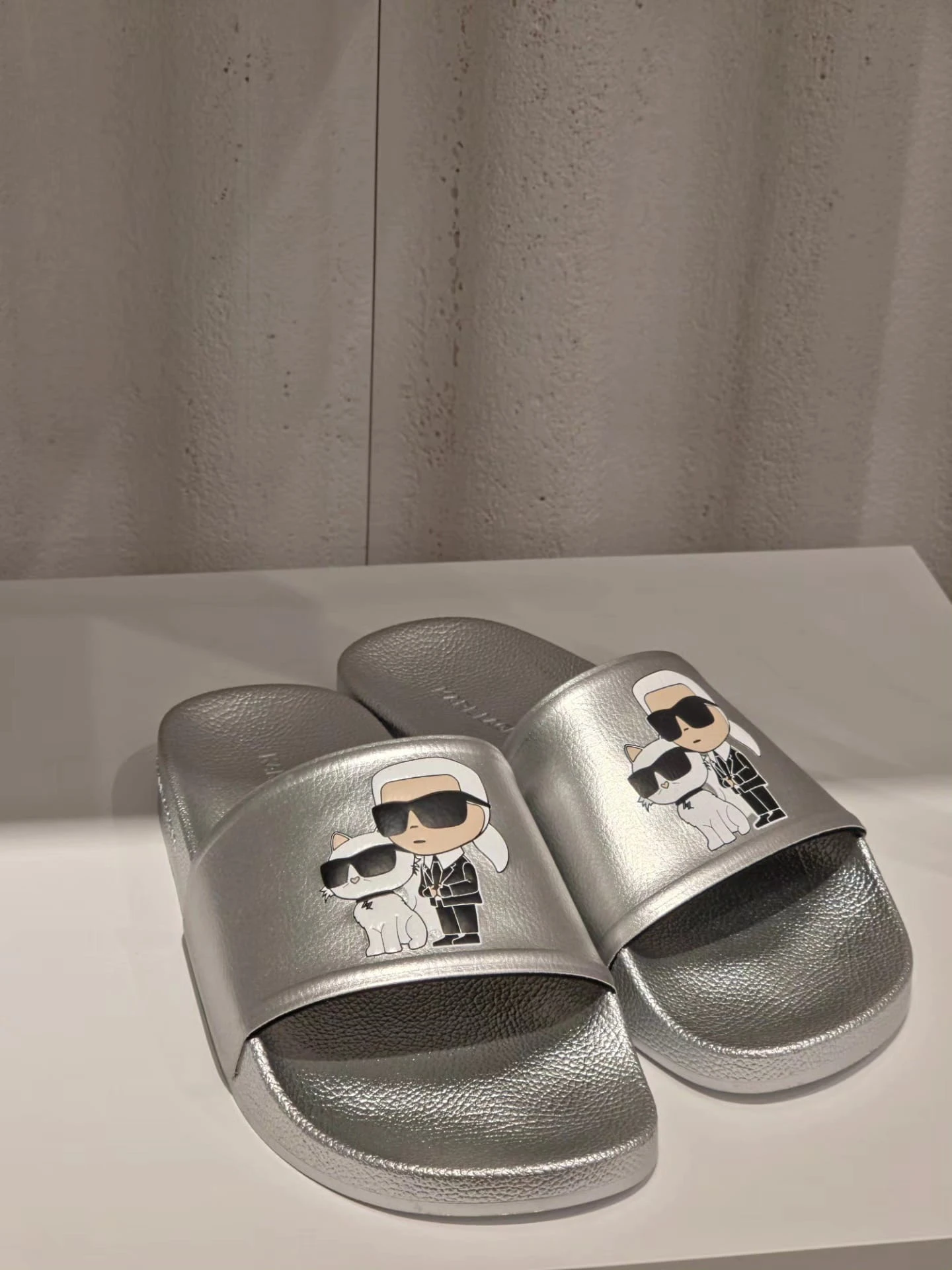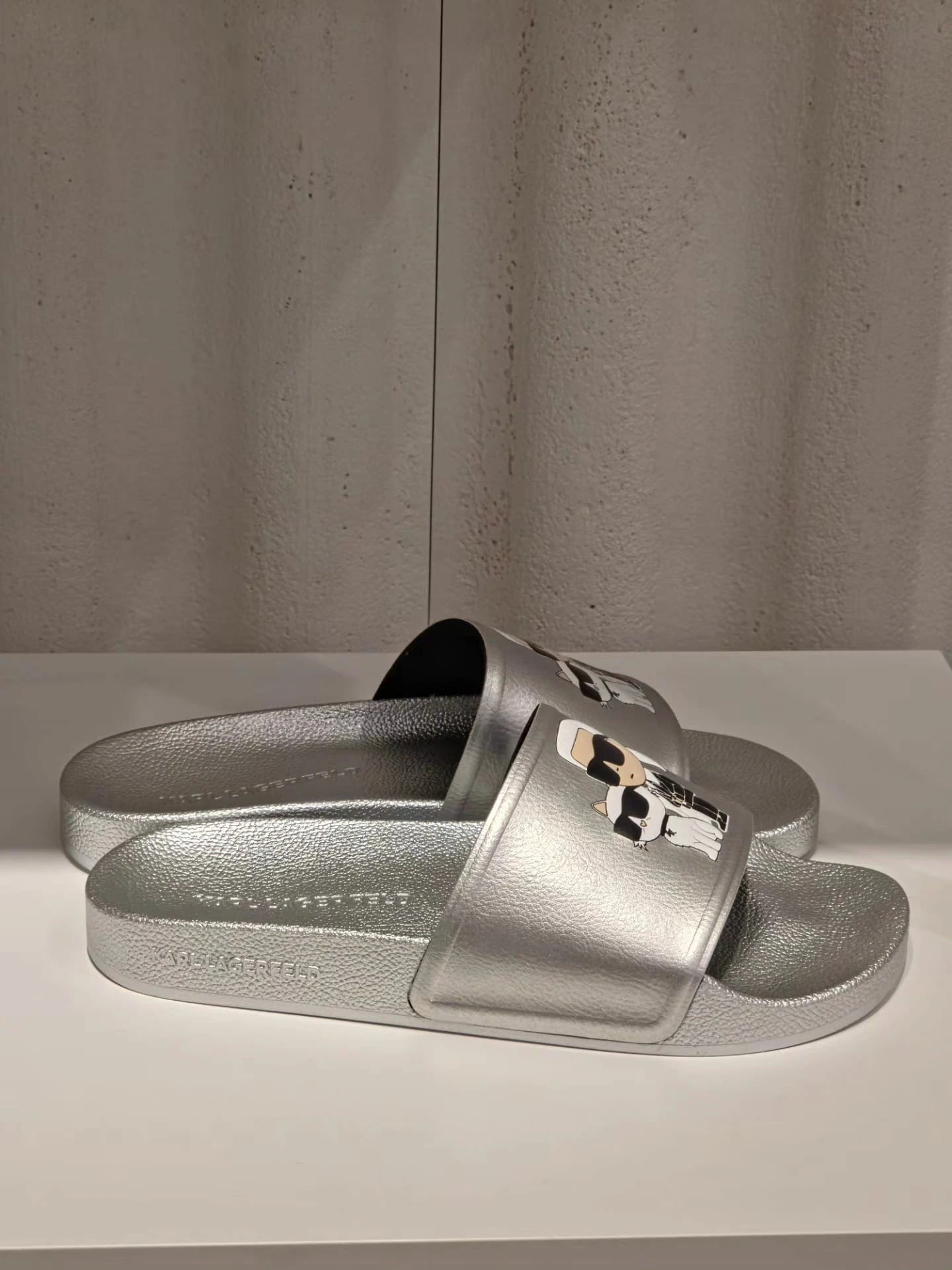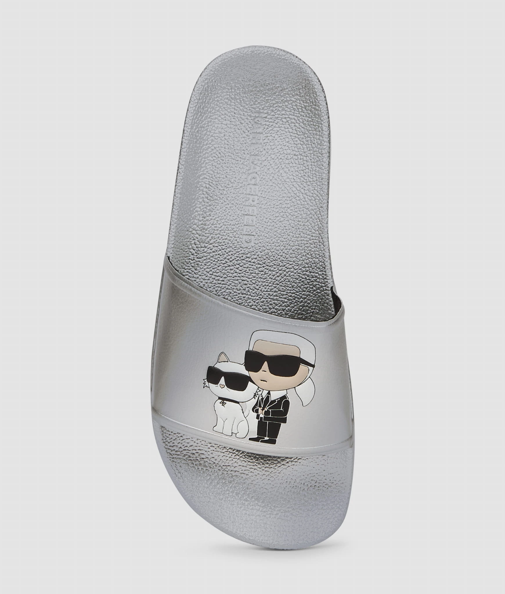Stylowe klapki KARL LAGERFELD w srebrnym kolorze z kultową grafiką IKON Karl i Choupette.