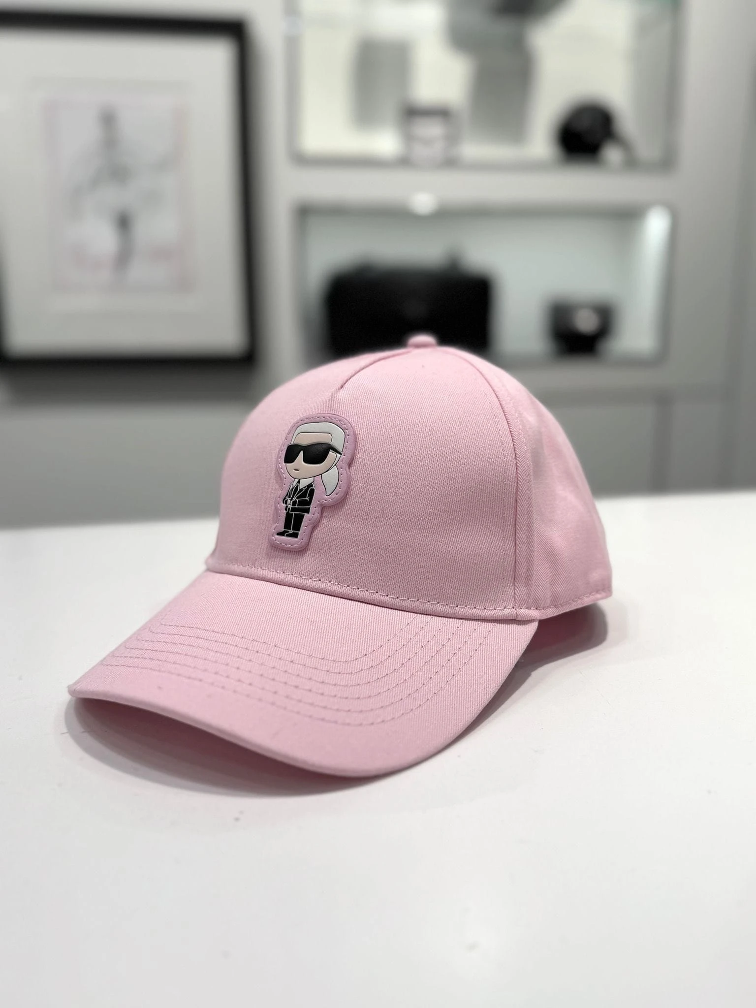 Różowa czapka z daszkiem Karl Lagerfeld z charakterystyczną aplikacją Ikonik Karl.