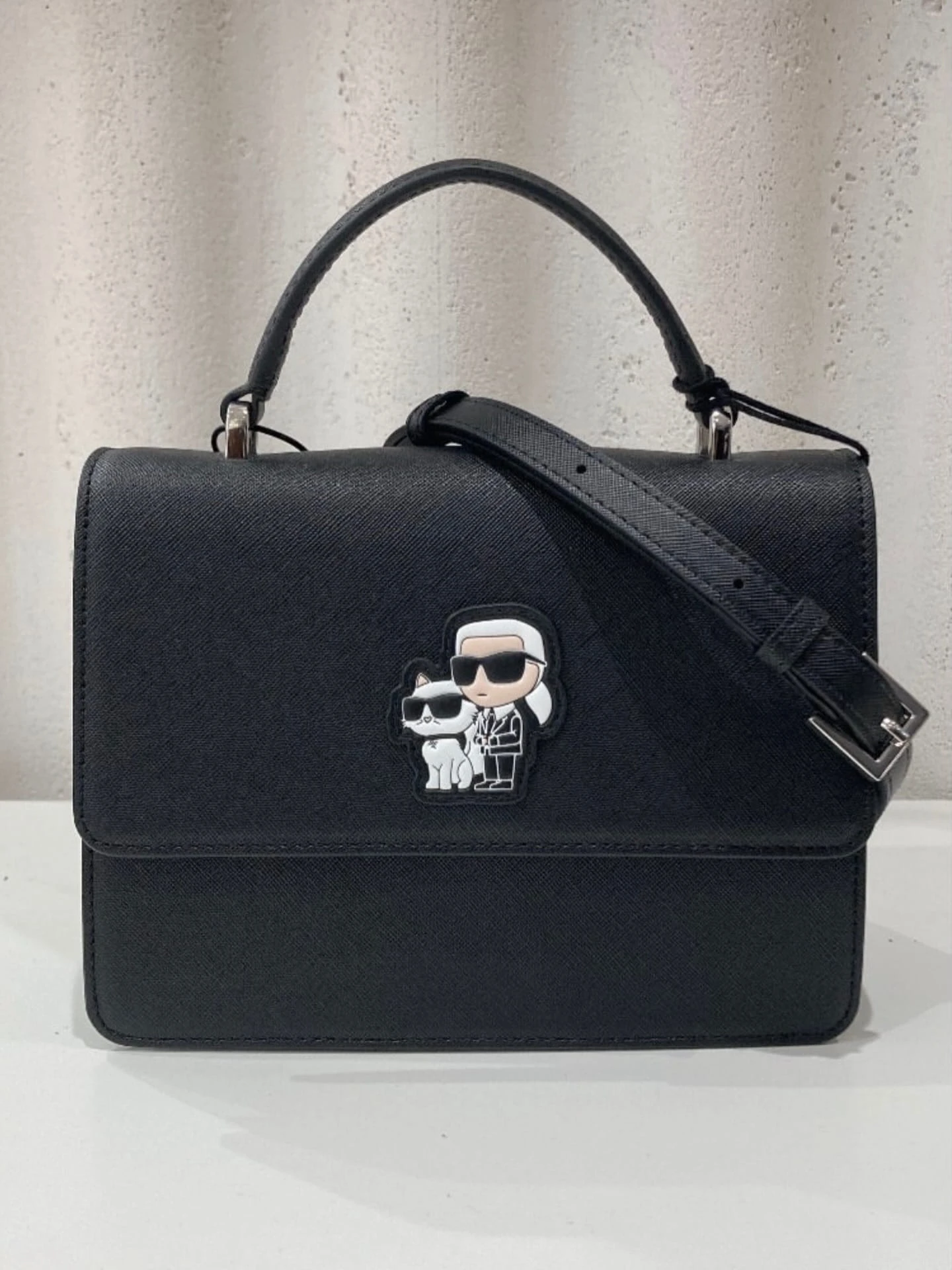 Torebka wykonana została z wysokiej jakości skóry ekologicznej o subtelnej strukturze, co zapewnia trwałość oraz estetyczny wygląd. Przód zdobi charakterystyczna aplikacja Karl i Choupette, która nadaje modelowi rozpoznawalnego charakteru i przyciąga uwagę.