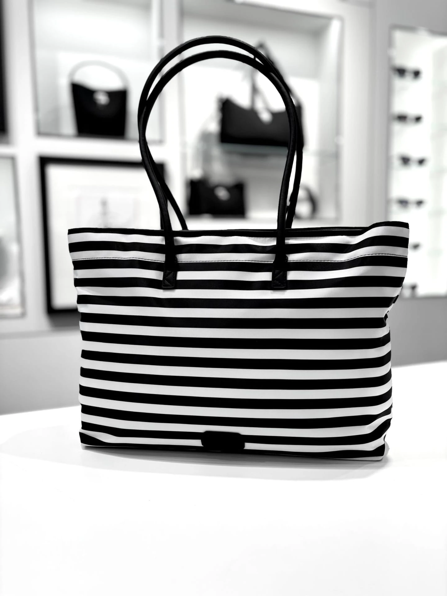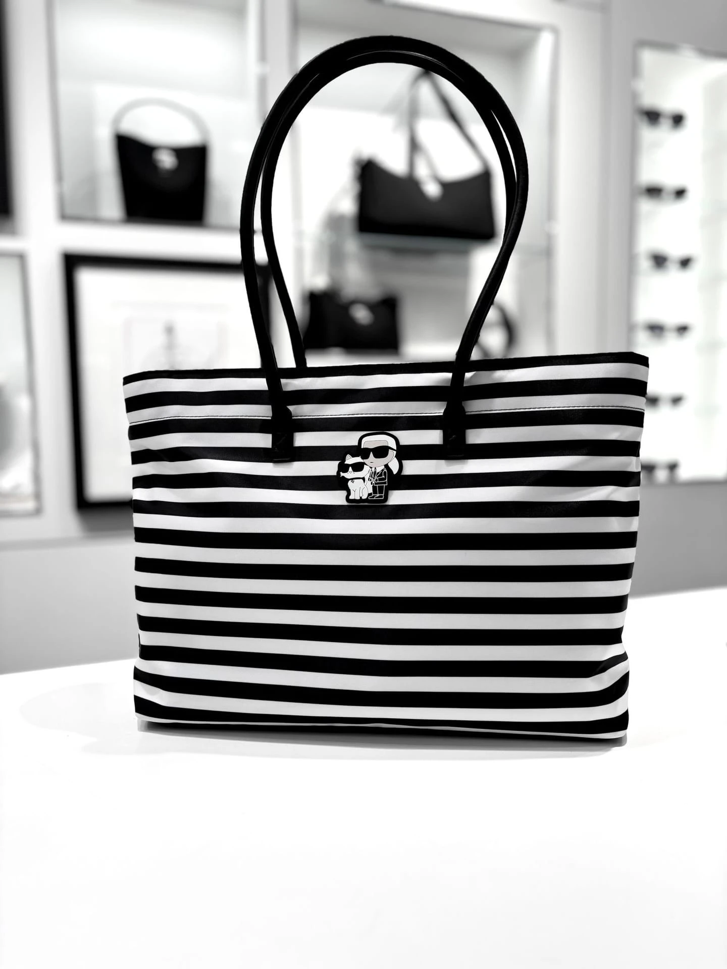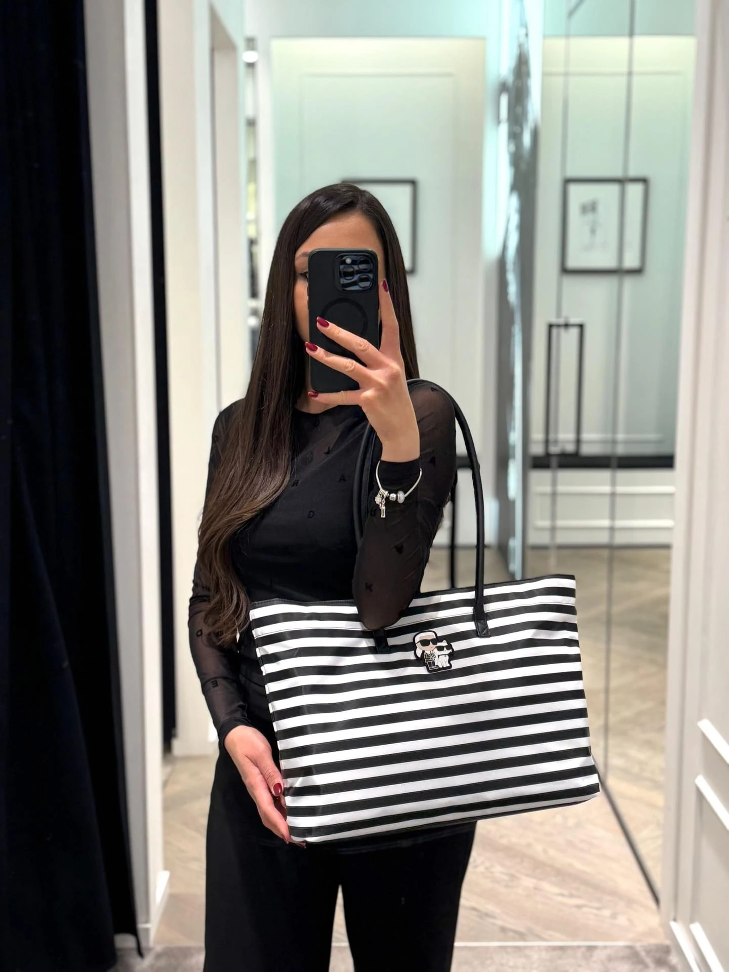 Karl Lagerfeld IKON Stripe Nylon Tote to duża i pojemna torba typu shopper wykonana z lekkiego nylonu. Idealna na co dzień, zakupy oraz wyjazdy – sprawdzi się również jako torba plażowa. Charakterystyczne paski w kolorze biało-granatowym oraz aplikacja Karl i Choupette nadają jej wyjątkowego stylu. Produkt oryginalny, pochodzi bezpośrednio od producenta.