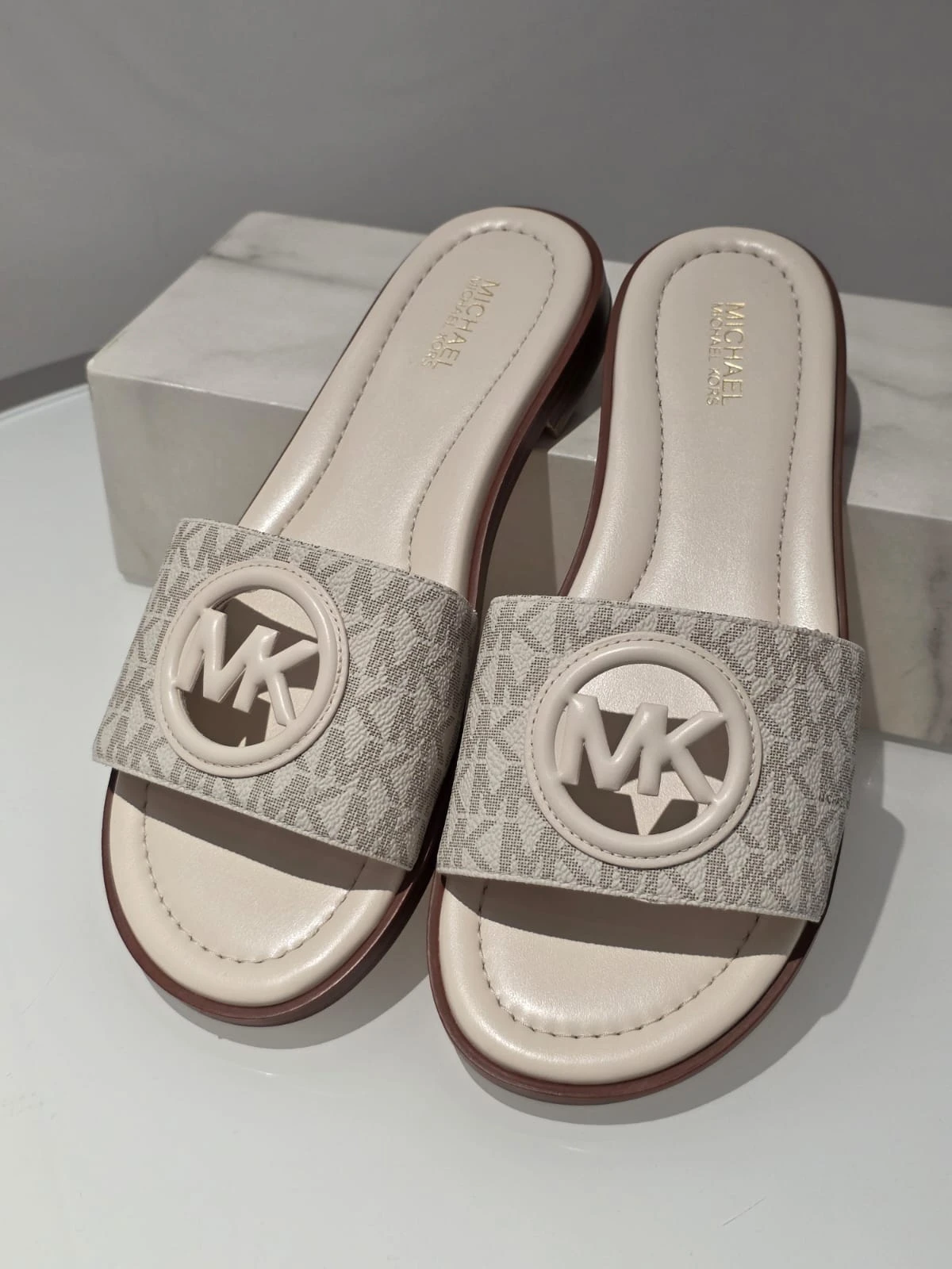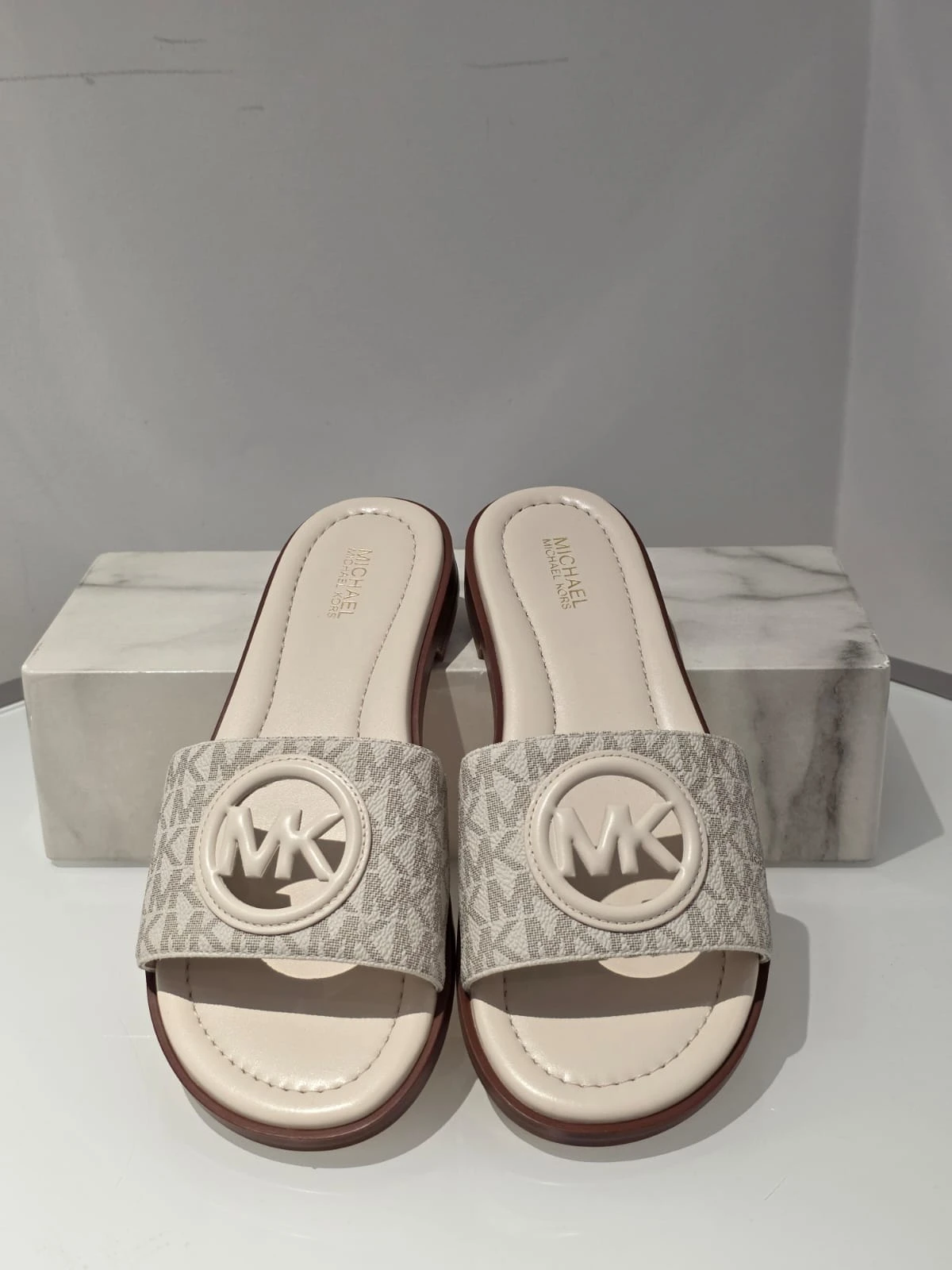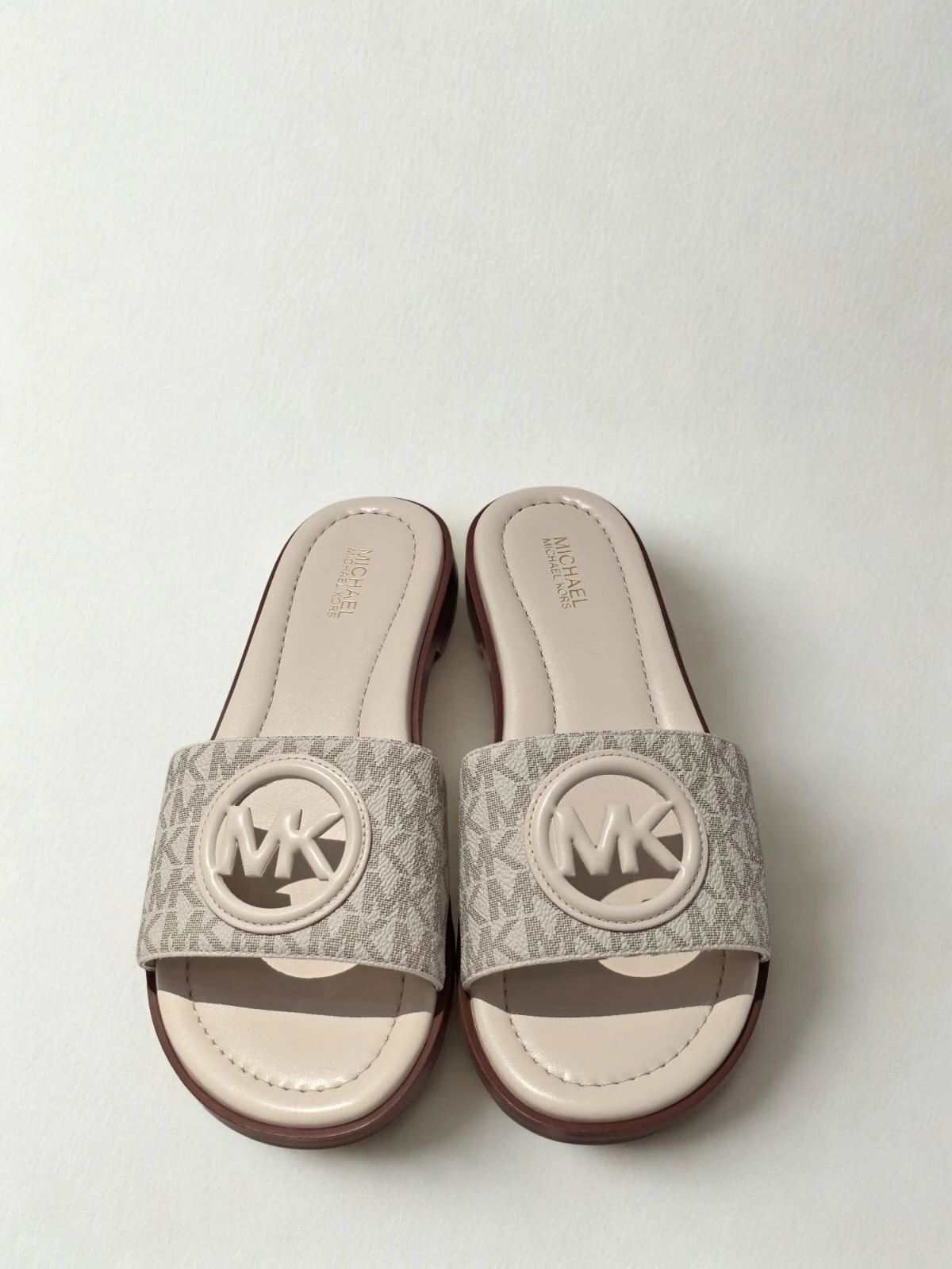 Stylowe klapki Michael Kors Carissa w klasycznym kremowym kolorze z charakterystycznym monogramem MK.