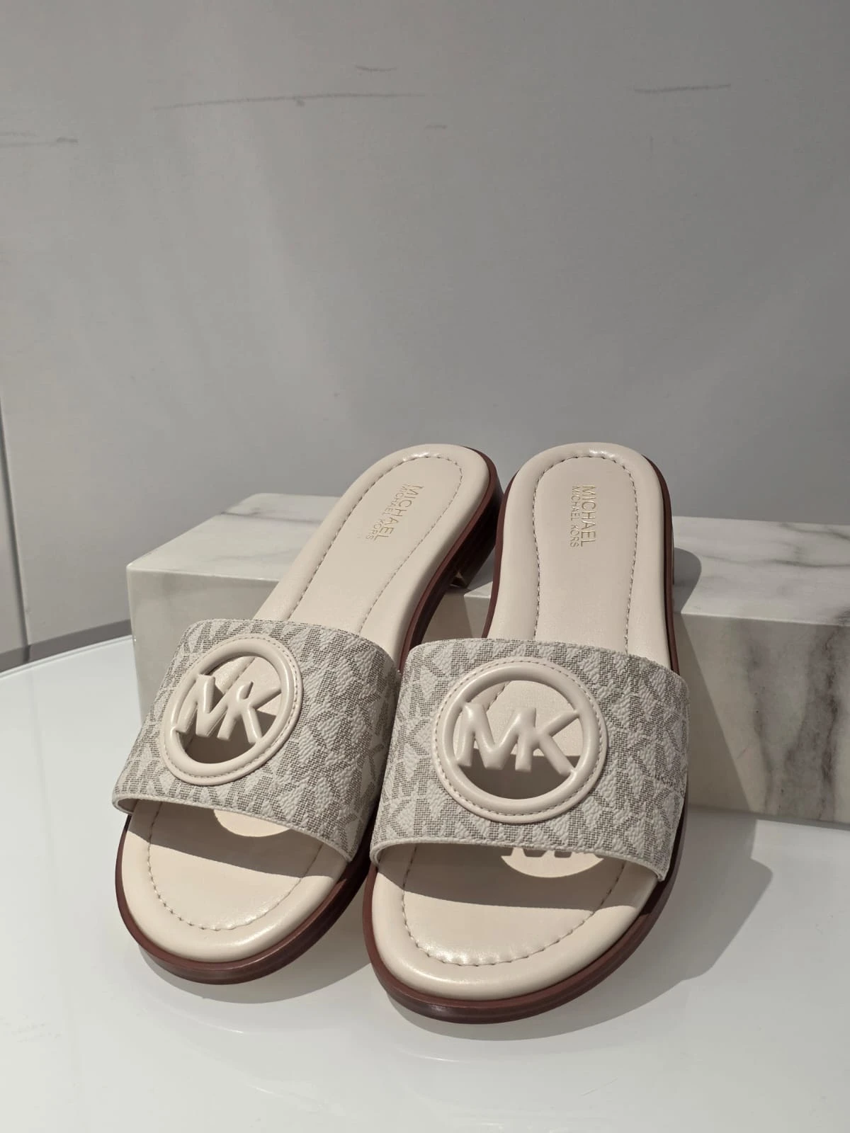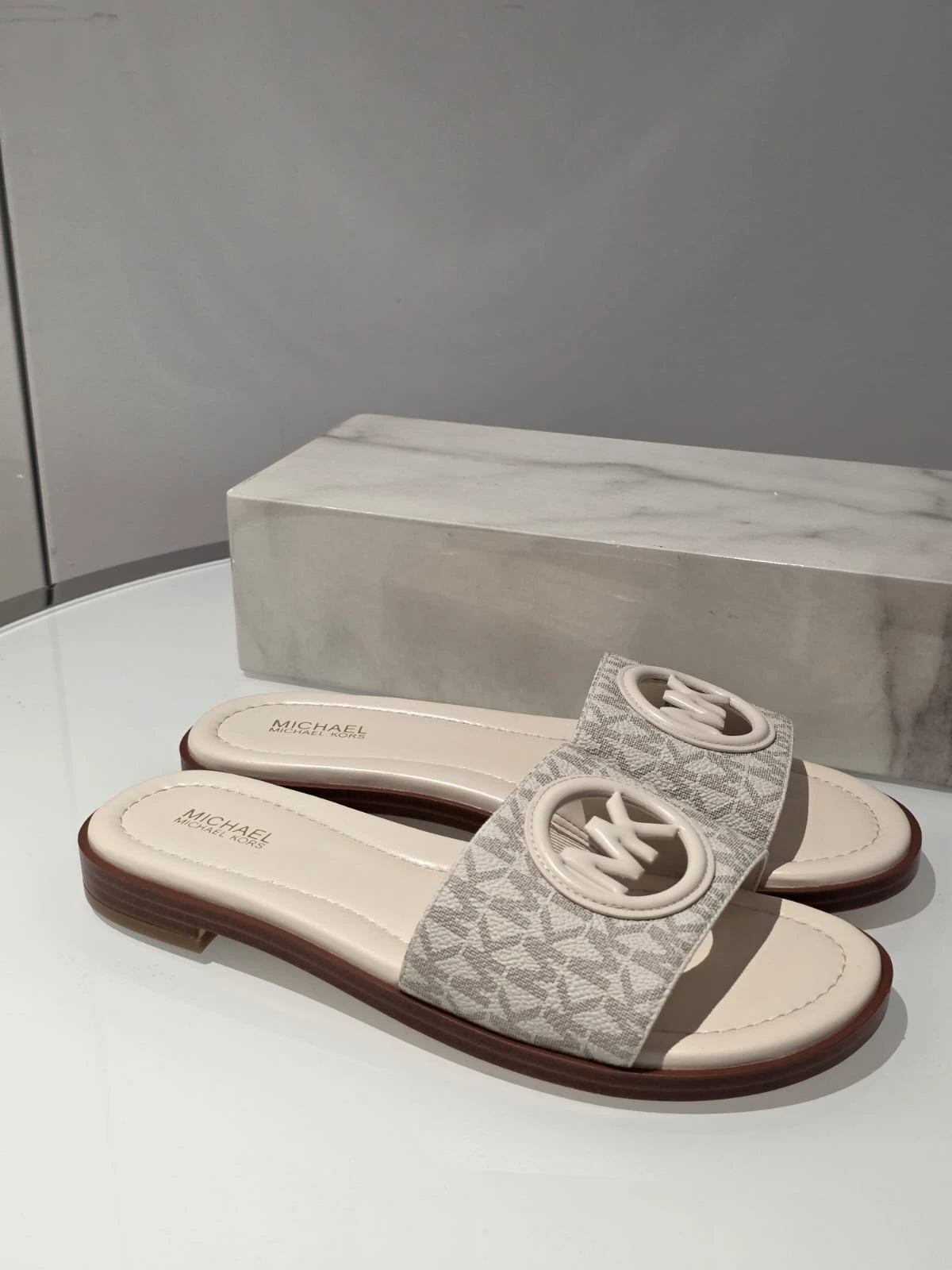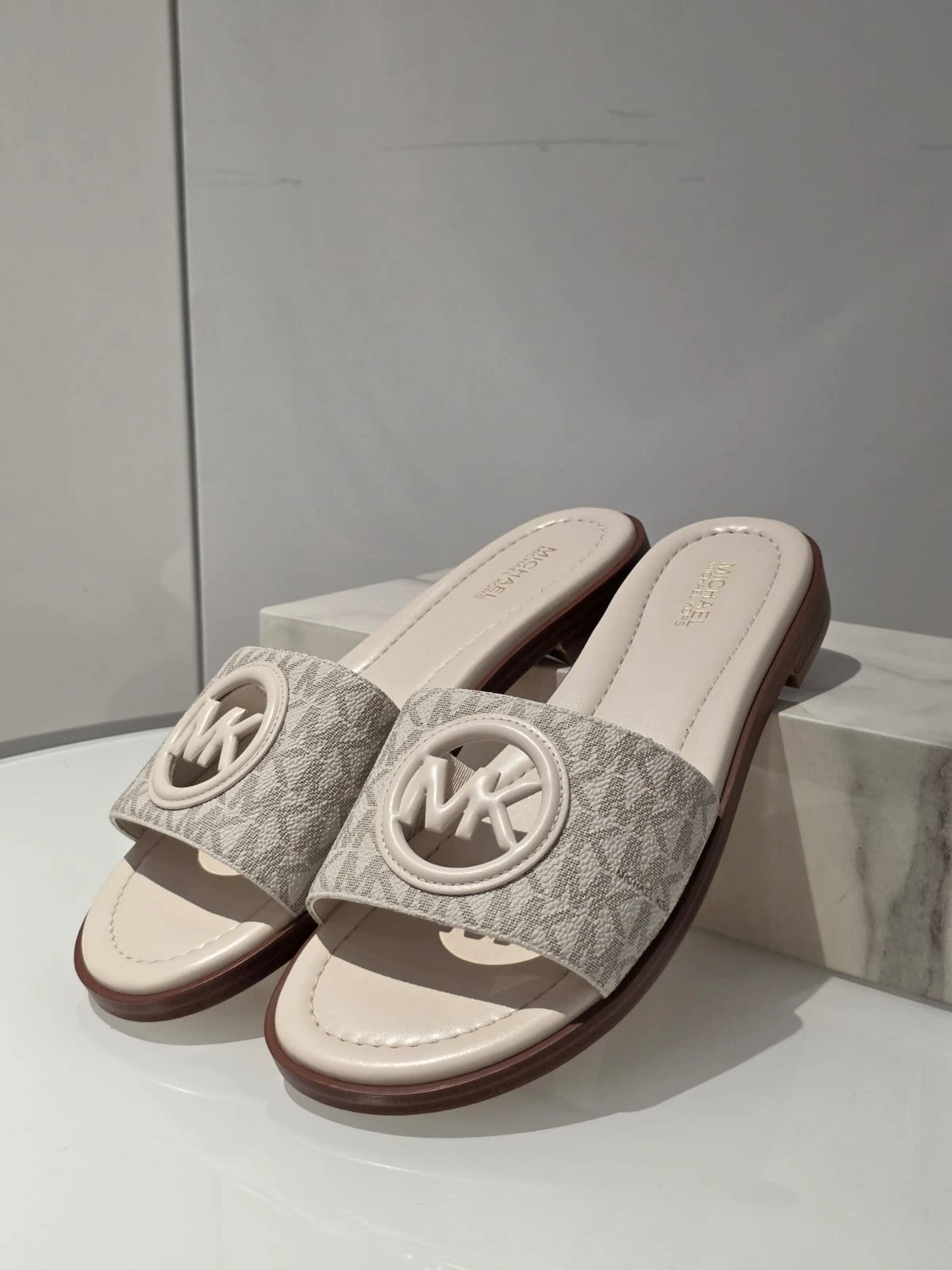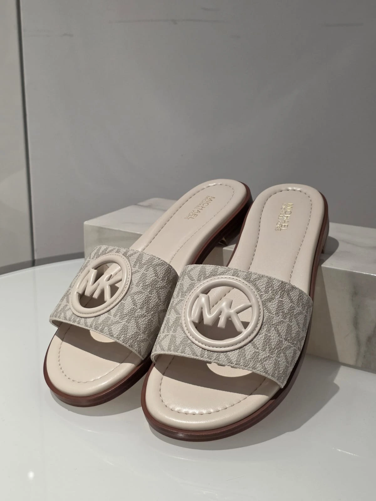 Stylowe klapki Michael Kors Carissa w klasycznym kremowym kolorze z charakterystycznym monogramem MK.