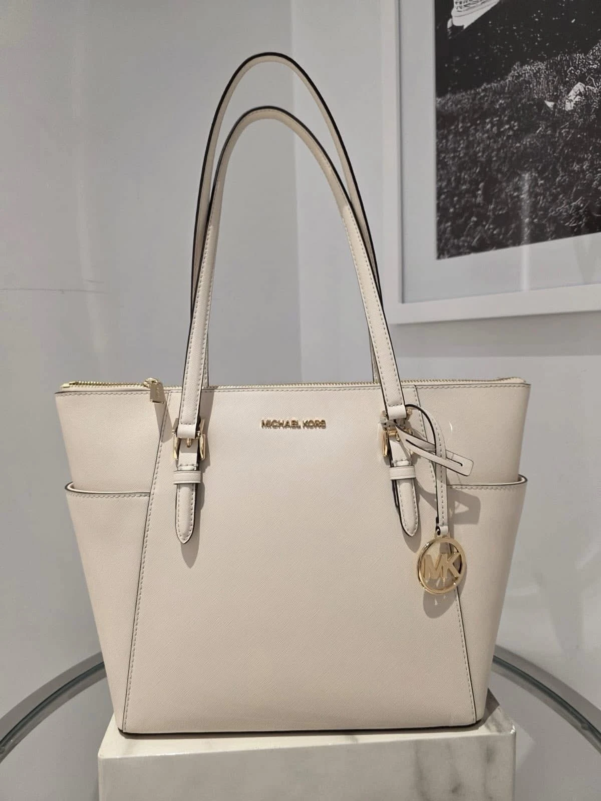 Michael Kors Charlotte Large Tote to ponadczasowa torebka damska, która łączy elegancki wygląd z praktycznym wnętrzem. Wykonana z wysokiej jakości skóry saffiano, prezentuje się stylowo i schludnie, a przy tym doskonale sprawdza się w codziennym użytkowaniu. Jasny odcień Light Cream oraz złote detale nadają całości kobiecego, luksusowego charakteru.