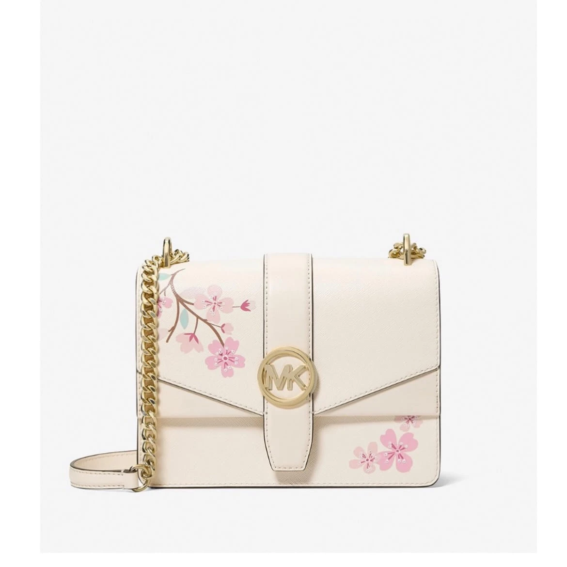 Elegancka torebka Michael Kors GREENWICH Sakura w kremowym kolorze z subtelnym motywem kwiatów. Klasyczna forma połączona ze złotymi detalami i łańcuszkiem tworzy kobiecy, dopracowany model idealny zarówno na co dzień, jak i na wyjścia.