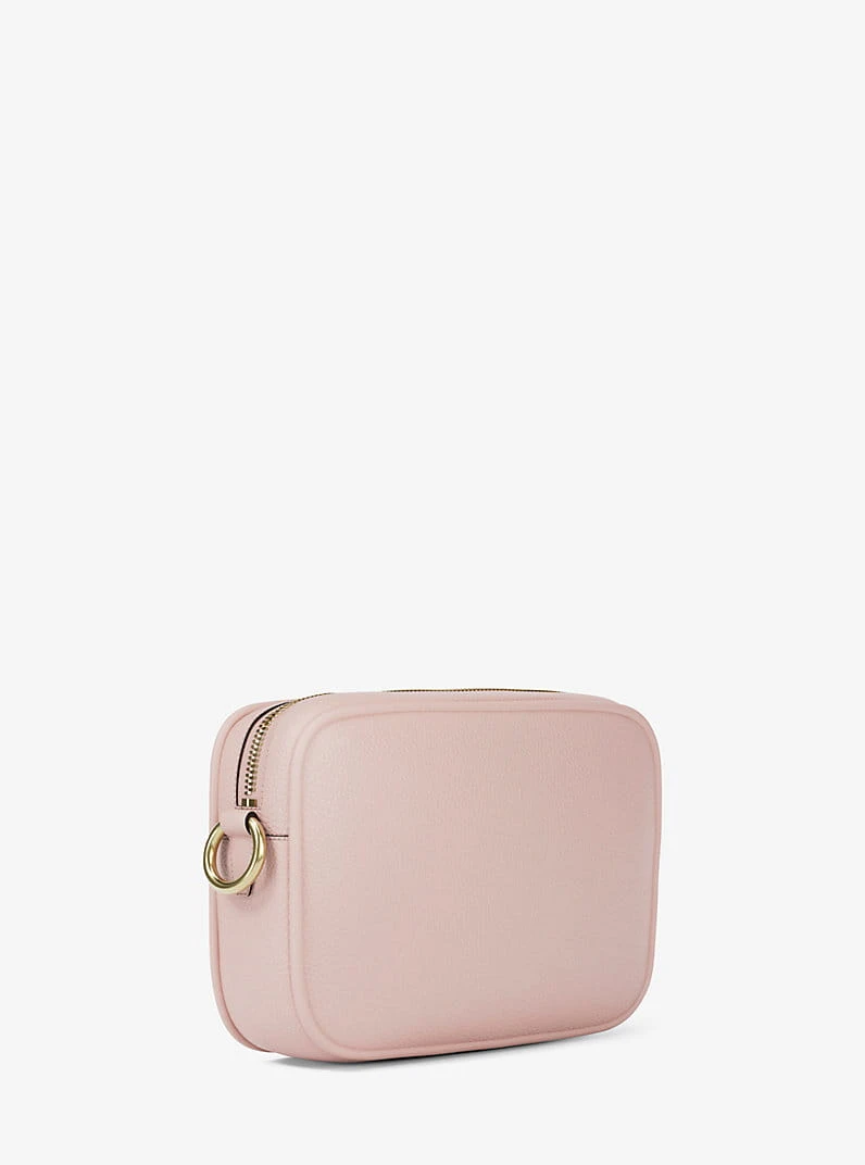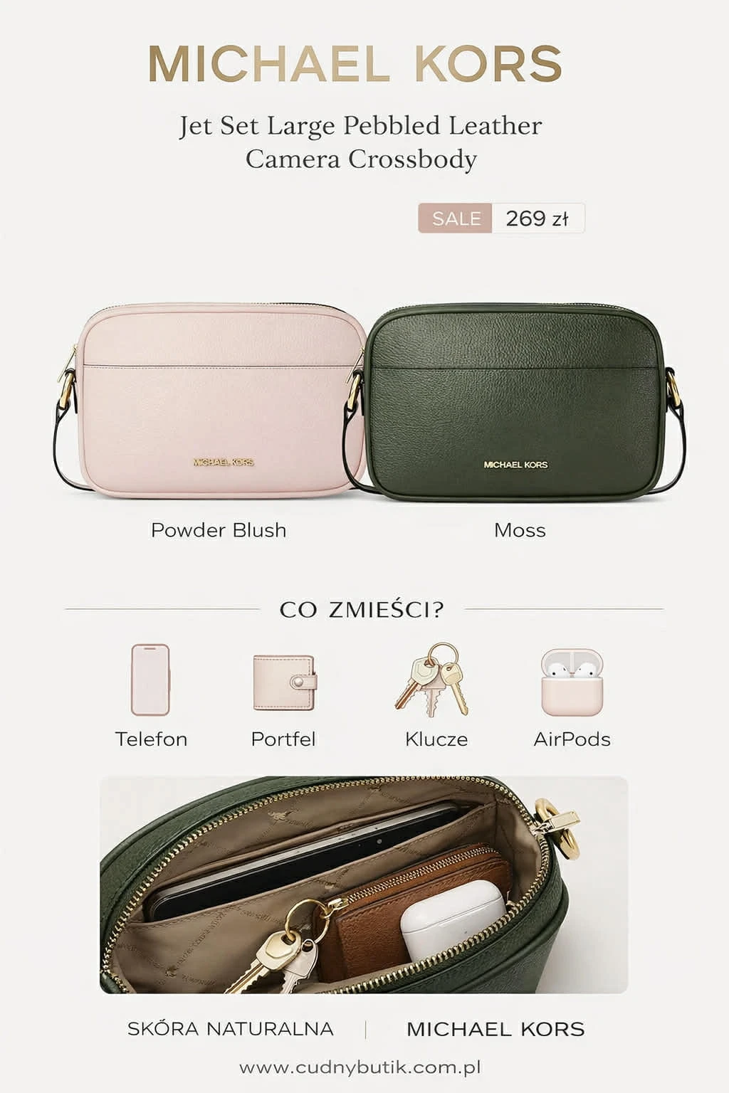 Michael Kors Jet Set Travel w kolorze Powder Blush to elegancka i kobieca torebka crossbody wykonana z naturalnej skóry licowej o subtelnie groszkowanej fakturze. Klasyczna sylwetka typu camera bag sprawia, że model prezentuje się nowocześnie, lekko i bardzo stylowo, a jednocześnie pozostaje wygodny w codziennym użytkowaniu.