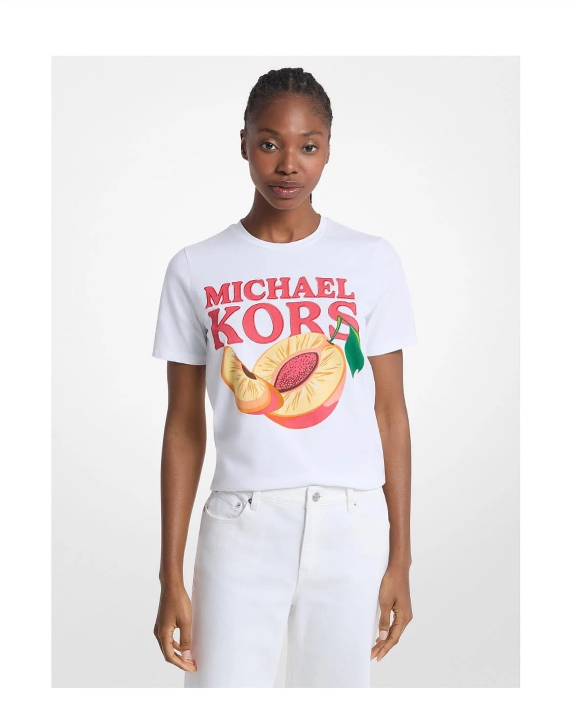 Michael Kors z limitowanej kolekcji Fruit to propozycja dla kobiet, które lubią świeże, lekkie i stylowe akcenty w codziennych stylizacjach. Klasyczna biała baza została przełamana efektowną owocową aplikacją, która nadaje koszulce modowego charakteru i sprawia, że model od razu przyciąga wzrok.