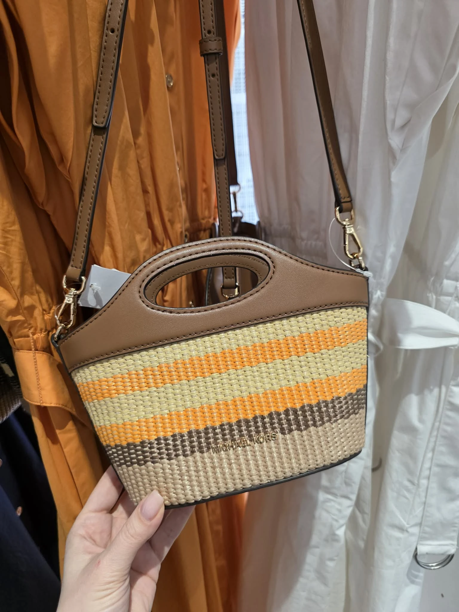 Mała torebka crossbody Michael Kors z plecionym korpusem w naturalnym odcieniu oraz eleganckim brązowym wykończeniem.