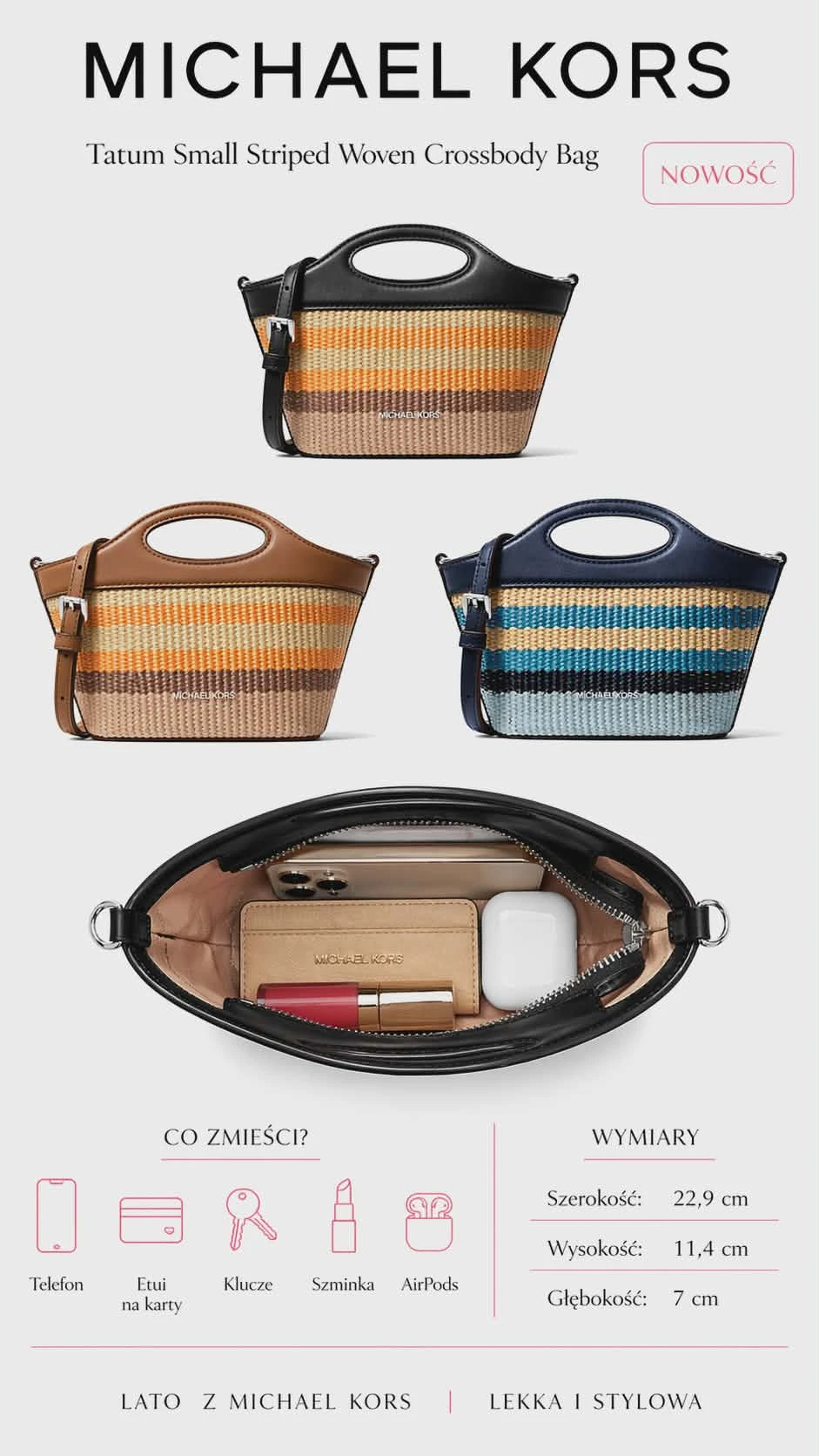 Michael Kors Tatum Small Striped Woven Crossbody Bag w wersji Navy Multi to wyjątkowa propozycja dla kobiet, które lubią dodatki łączące elegancję z lekkim, wakacyjnym charakterem. Pleciona struktura w połączeniu z paskami w odcieniach błękitu, beżu i granatu nadaje tej torebce świeży, stylowy wygląd, który pięknie uzupełnia codzienne i letnie stylizacje.