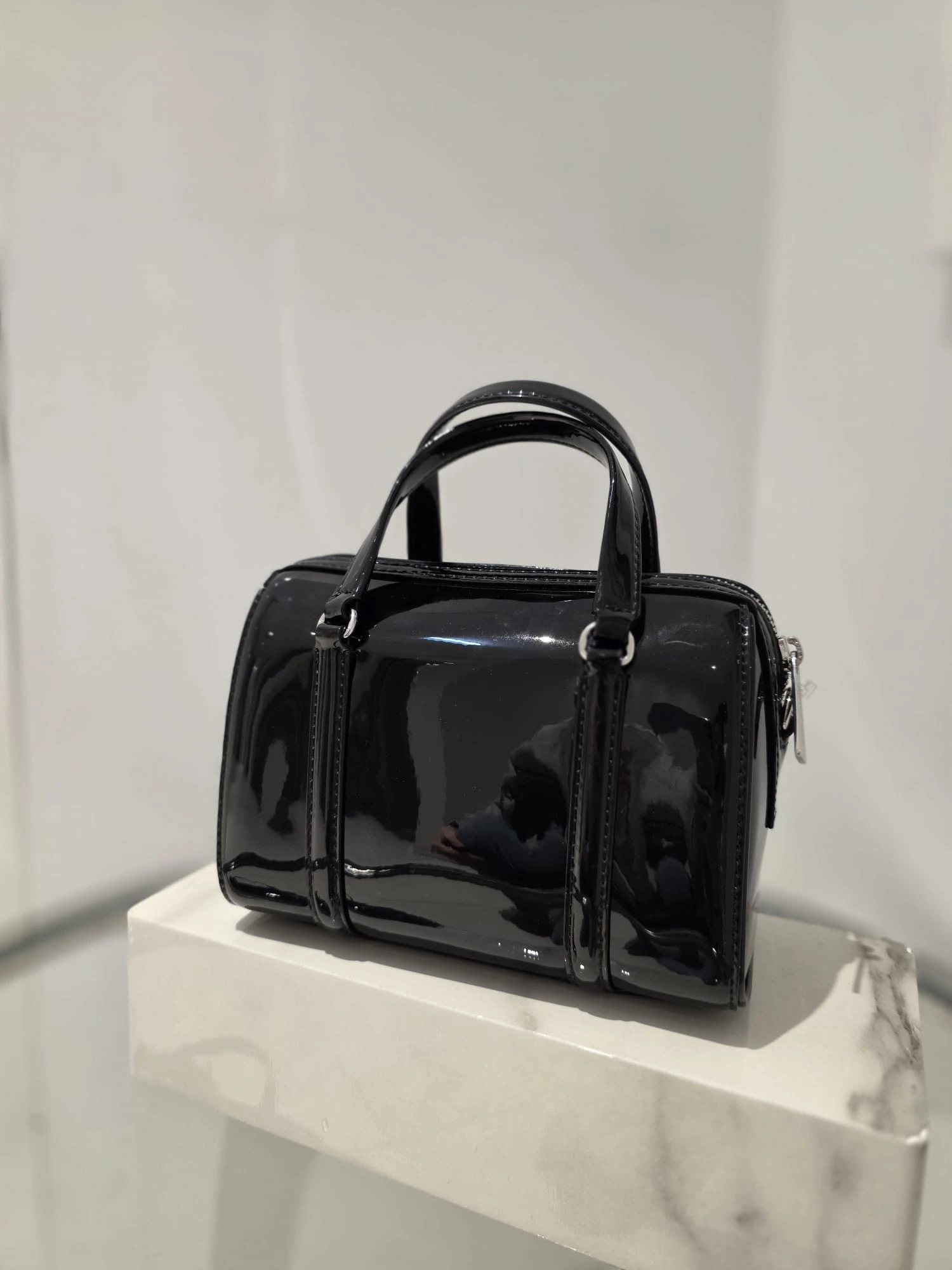 Kompaktowy model typu mini duffle łączy efektowny połysk z wygodą noszenia na co dzień i na wyjścia.
