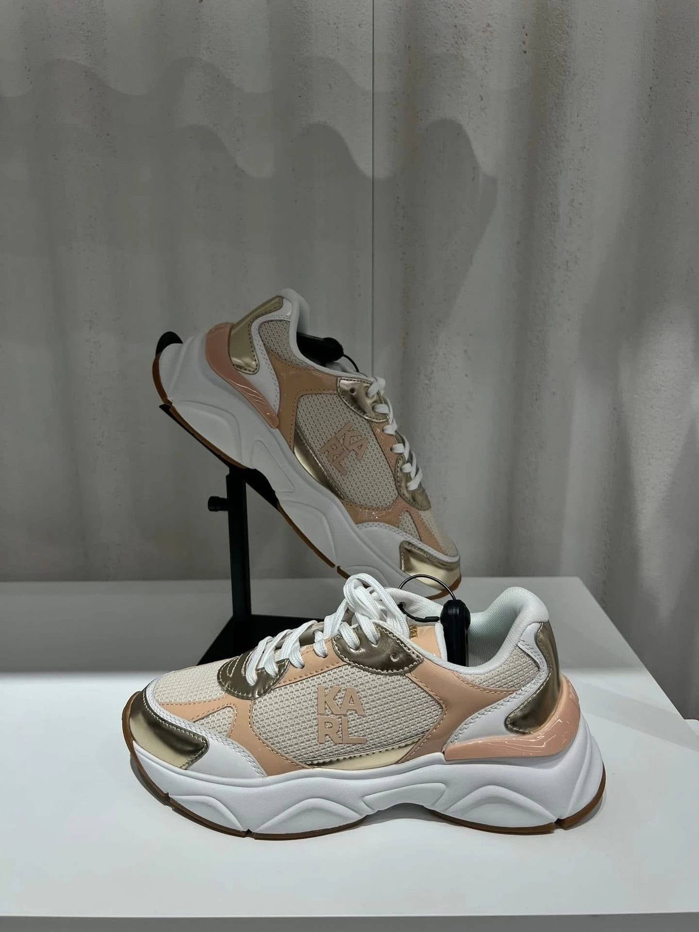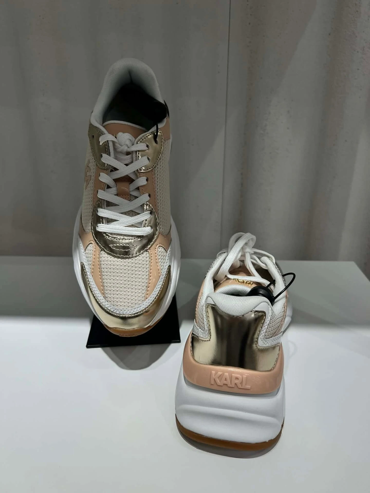 Karl Lagerfeld Sporty Mesh Runner to nowoczesne sneakersy inspirowane stylem runningowym. Lekka, przewiewna cholewka z siateczki oraz masywna, amortyzująca podeszwa zapewniają wygodę przez cały dzień. Eleganckie połączenie beżu i złota z logo KARL sprawia, że model doskonale pasuje zarówno do codziennych, jak i sportowych stylizacji.