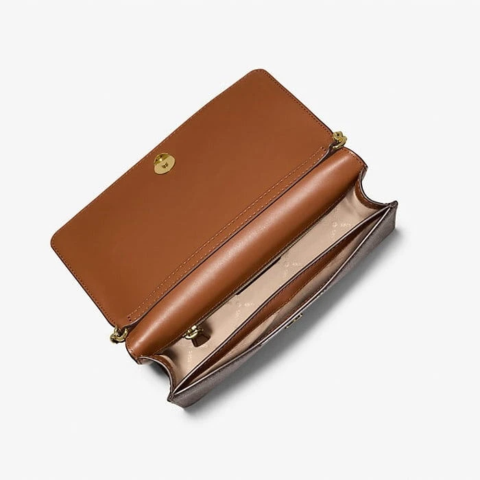 Michael Kors Jet Set Medium Signature Logo Crossbody w kolorze Brown Monogram to klasyczna, ponadczasowa torebka damska z charakterystycznym wzorem MK i złotymi detalami.