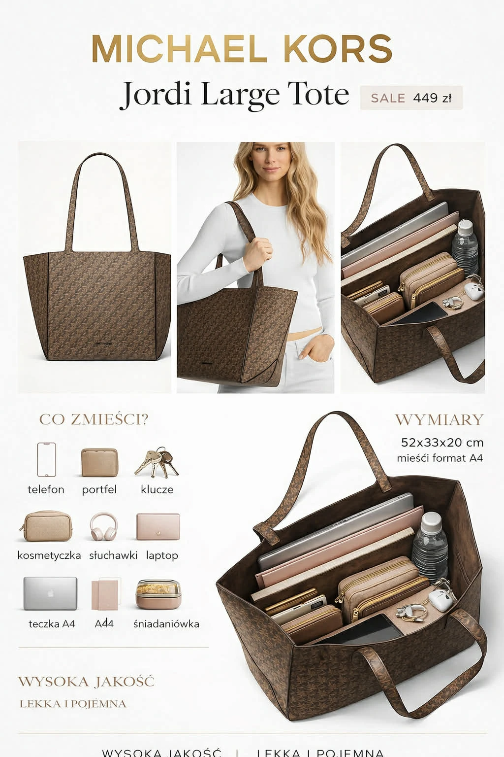 Michael Kors Jordi Large Tote Bag to pojemna i nowoczesna torba typu shopper w charakterystycznym wzorze Empire Monogram. Lekka, praktyczna i wygodna w noszeniu na ramieniu, świetnie sprawdzi się do pracy, na wyjazdy i na co dzień. Duży format, minimalistyczna forma i możliwość złożenia na płasko czynią z niej model wyjątkowo funkcjonalny.