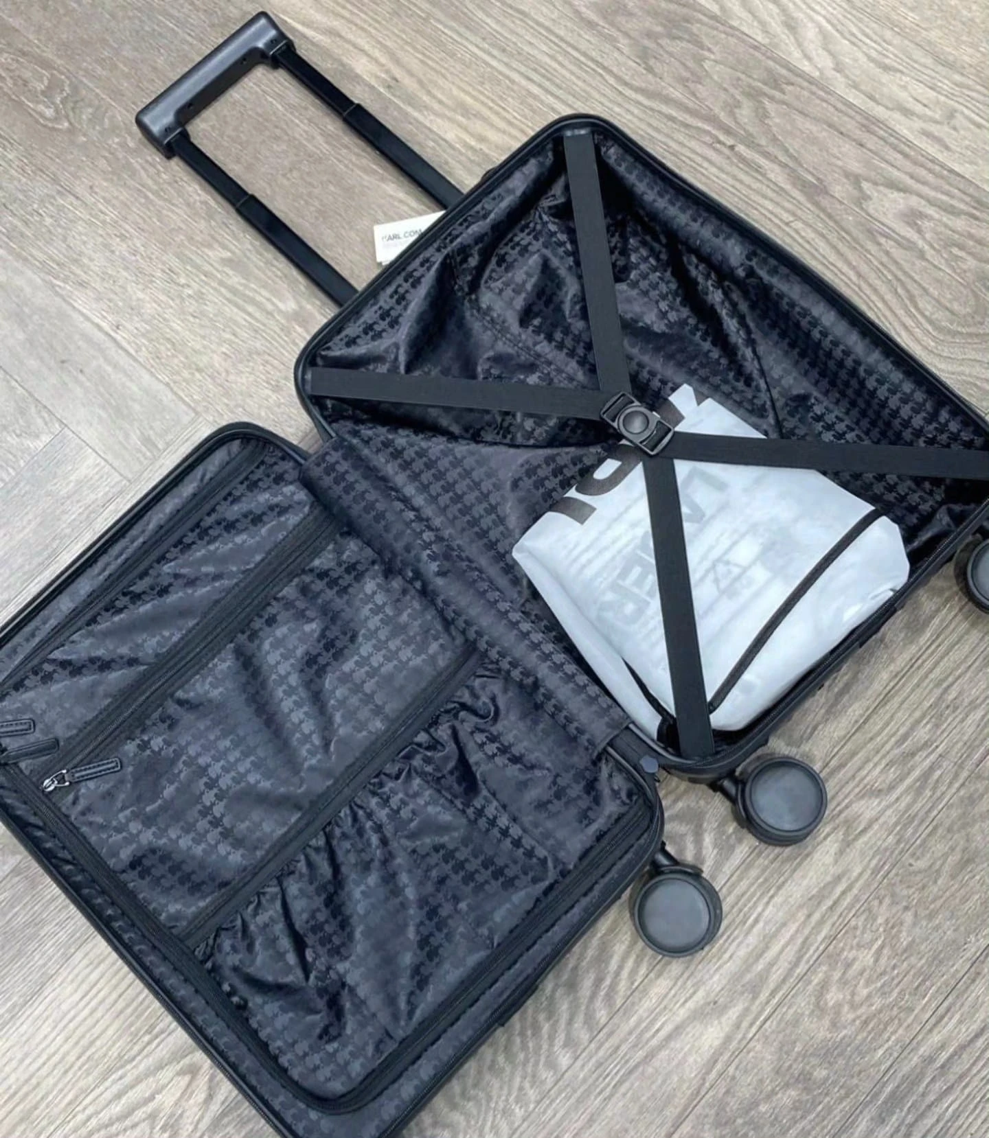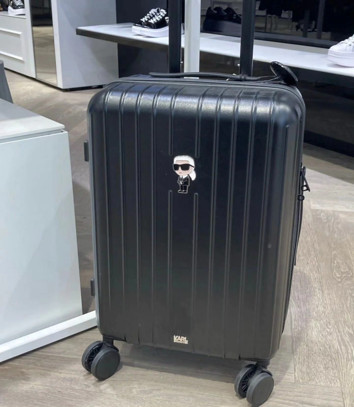 Nowoczesna walizka kabinowa KARL LAGERFELD z kolekcji IKON. Minimalistyczny design, lekka konstrukcja i obrotowe kółka 360° zapewniają maksymalny komfort podróży – idealna na krótkie wyjazdy i loty.